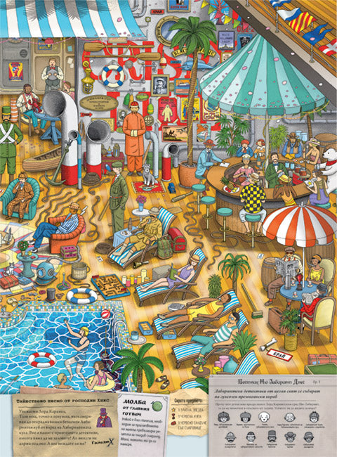 Книгата е богато илюстрирана с красиви детайлни картини, в които могат да се открият множество сюжетни линии. Добавената в комплекта детективска лупа ще ви помогне да разгледате отблизо всичко съдържащо се в картините, надписи и хора и да се забавлявате с тях.